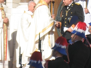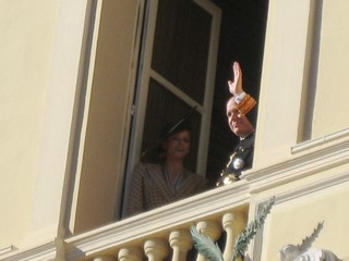 Conclusa la funzione religiosa, i festeggiamenti si spostano e continuano sulla Piazza del Palazzo. Sono numerose le presenze in questo 2010 e la festa è stata più partecipata e gioiosa della scorsa edizione. Ancora applausi, quando dal balcone centrale, si affacciano S.A.S. il Principe Alberto II ed al suo fianco appare l'elegante figura di Charlene. Ancora visibilmente emozionata, quello che davvero ha sorpreso stando accanto agli addetti ai lavori, è il rumore degli scatti impazziti degli apparecchi fotografici. Tutti gli obiettivi sono rivolti alla coppia ed è sufficiente un piccolo gesto, uno sguardo complice, un sorriso d'intesa dei fidanzati, a raddoppiare, a triplicare il sottile rumore dei "clic".