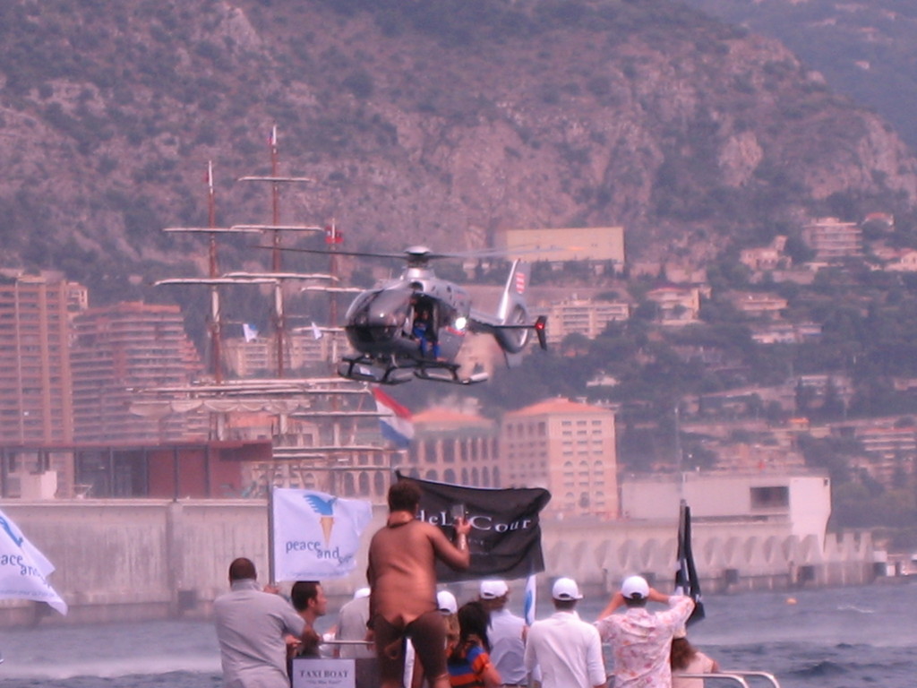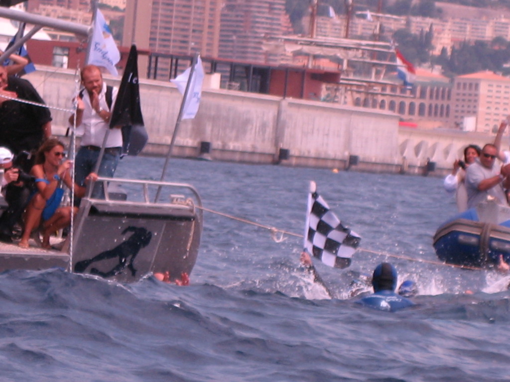 La mattina inzia alle 11.30: una decina di imbarcazioni dal Porto di Fontvieille ci aspettano per condurci di Fronte al Museo Oceanografico. L'arrivo di Pierre Frolla in elicottero è una vera festa. Da 5 anni a Monte-Carlo non si ripeteva più la tradizione della mitica bandiera a scacchi recuperata in immersione. E'stato lo stesso campione monegasco ad ideare e lanciare questa iniziativa che per due anni, nel 2005 e nel 2006, ha accompagnato e dato "il via" simbolico al Gran Premio di Formula Uno.