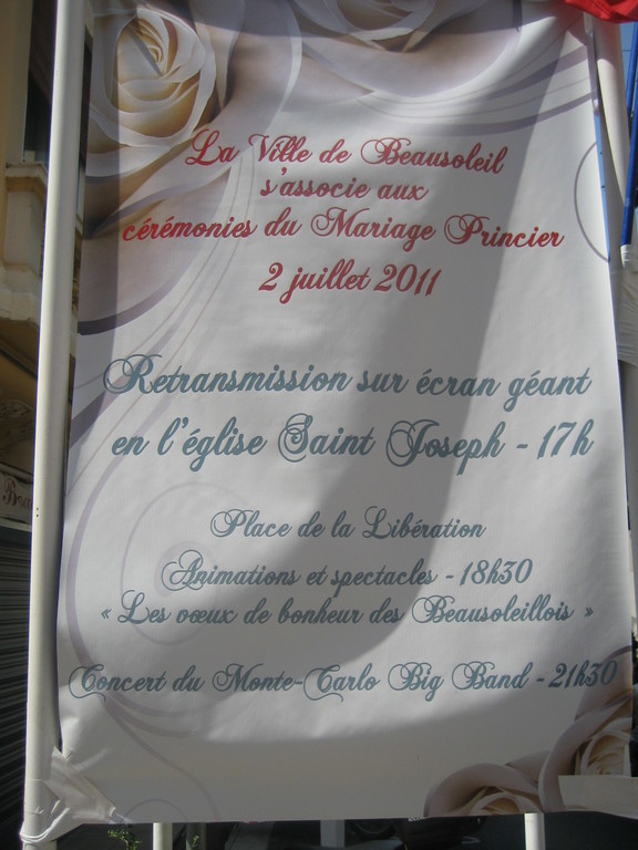 Anche i comuni limitrofi al Principato splendono di luce riflessa per i 2 giorni di festa dedicati al Matrimonio del Sovrano monegasco. Ecco le inedite immagini del comune di Beausoleil addobbato a festa con le bandiere del Principato di Monaco, le strade principalli ed alcuni negozi. Di fronte a palazzo civico anche una banidera con la scritta: "Il comune di Beausoleil si associa alla cerimonia del Matrimonio Principesco del 2 luglio 2011. Trasmissione su schermo gigante nella Chiesa St Joseph dalle 17.00 in Place de la Liberation. Animazioni e spettacolo dalle 18.30 Auguri di felicità degli abitanti di Beausoleil e concerto della Monte-Carlo Big Band alle 21.30".