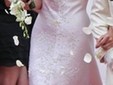 Un abito da sposa con una linea fluida in seta dichessa bianca tagliato con un lungo strascico con scollo incrociato sul davanti e sulla schiena dove nasce il secondo strascico all'andrienne. Il davanti del vestito, il bordo e la parte centrale della coda sono ornate di un ricamo floreale a rami realizzato in perle dorate cristalli svaroski e gocce di madreperla nei toni bianco e oro. Il lungo velo in seta bianca tagliato con veletta frontale delicatamente bordato.