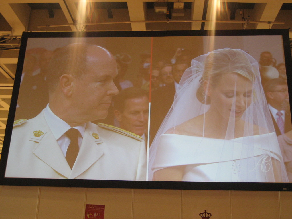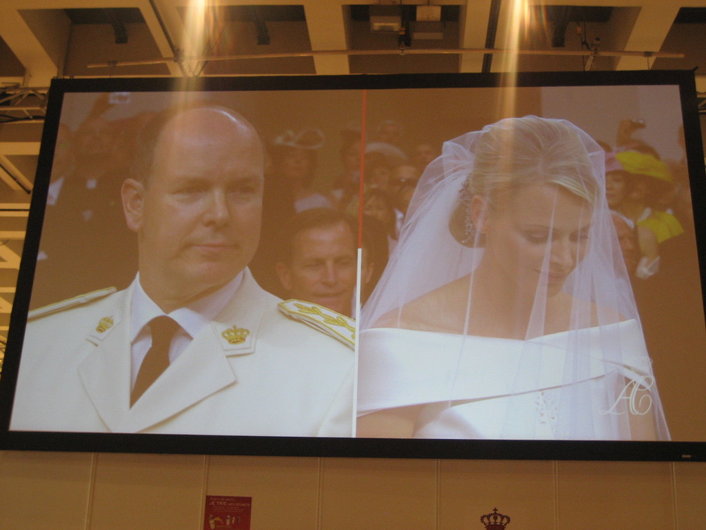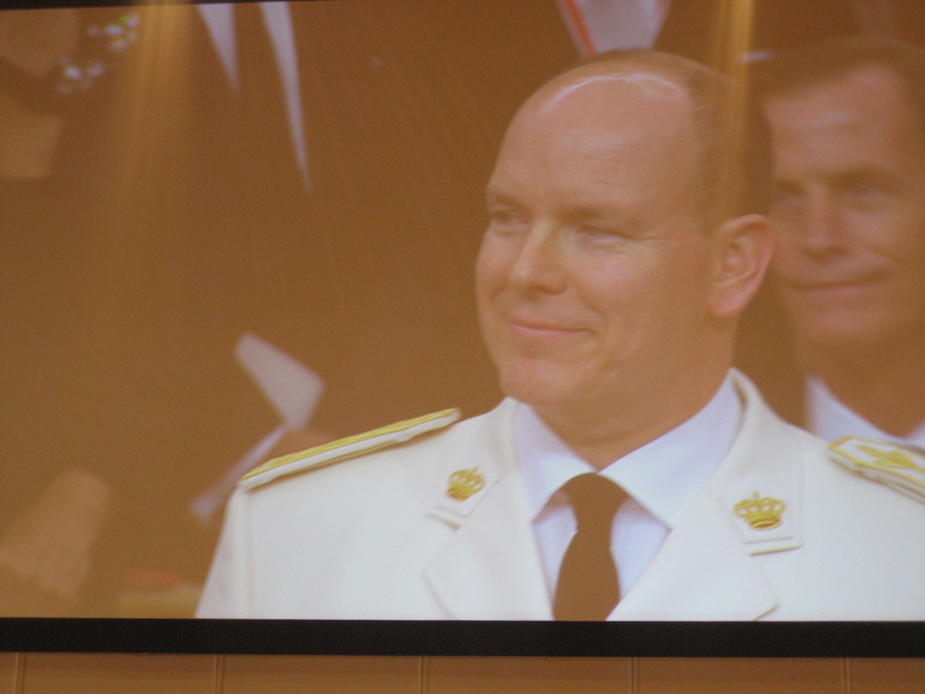 Ecco la Principessa Charlene nel suo Armani Privè: una linea fluida per l'abito in seta bianca duchesse incrociato sul davanti. Un abito che ha contato 2 500 ore di lavoro e 40 mila Swarovski. Anche SAS il Principe Alberto è bellissimo ed elgantissimo con l'alta uniforme bianca. La messa officiata dall'Arcivescovo di Monaco e concelebrata da numerosipreti è appena iniziata.
