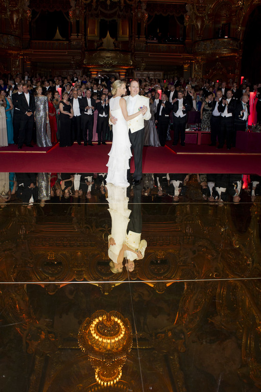 Svelata in questa immagine anche la Sala dell'Opera Garnier, completamente reinventata per accogliere la serata di chiusura del 2 luglio ed il ballo di Gala. Come nelle più belle favole ad aprire le danze sono stati i Principi Alberto II e Charlene. Lei molto raffinata in un abito leggiadro, sempre Armani Privé, in mousseline di seta bianca tagliata con 4 volant ed arricchita con un ricamo degradé realizzato con gocce in cristallo Swarovski e perle in tinta oro e platino. Nell'immagine oltre ai 450 invitati alla cena ed alla serata di gala è possibile scorgere i fasti del soffitto e delle pareti creati dall'architetto Charles Garnier.