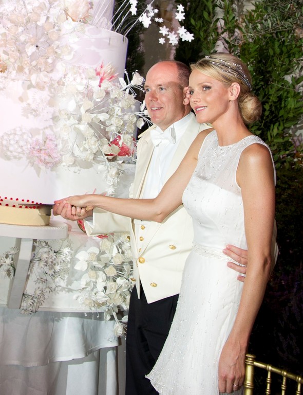 Nell'immagine sottostante la coppia di sposi al taglio della torta in cui domina il famoso decoro con la protea