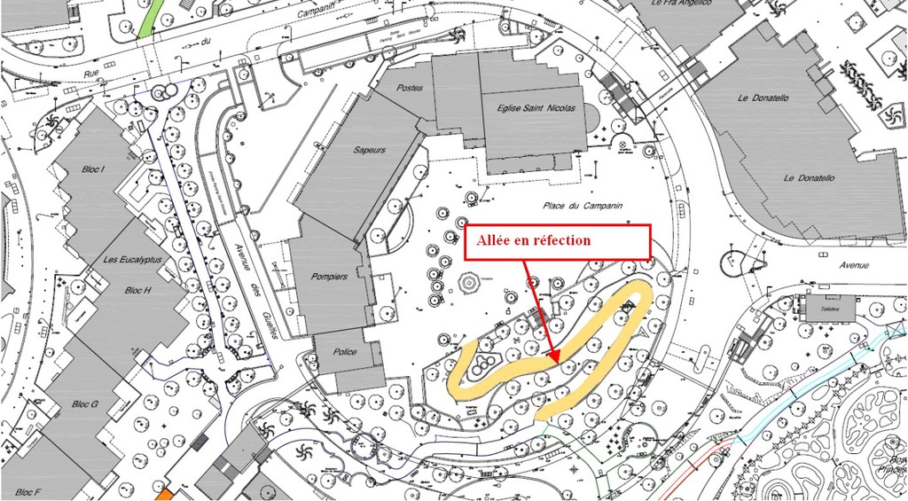 La Direction de l’Aménagement Urbain di Moaco procede al rifacimento delle strade nei quartieri di Fontvieille. Un programma che durerà 5 anni. Dopo aver reealizzata la parte compresa nelle zone C e F (nell'immagine) i lavori riguardano ora la strada che unisce la place des Campanins. I lavori hanno preso il via per rinnovare tutta la rete d'illluminazione e l'asfalto. La strada sarà chiusa fino a metà dicembre 2011.