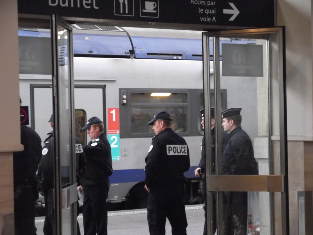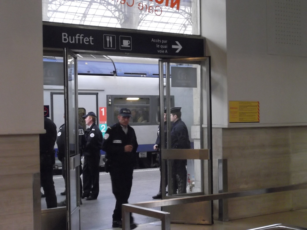 Nice Riquier, Nice Ville. Fine della nostra corsa e scendiamo dal treno. Eccole le forze dell'ordine. 6 i Poliziotti per ciascuna uscita. Appena scesi nella stazione centrale buttiamo un'occhiata timida, di poliziotti ne contiamo una decina. Ma potrebbero essere di più. Guardano, scrutano tutti. Scrutano anche noi. E non senza una sorta di imbarazzo, appena varcata la prima porta, rubiamo qualche scatto.