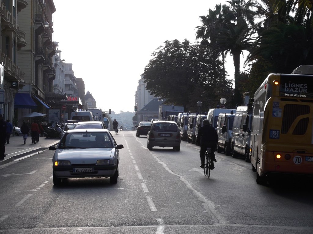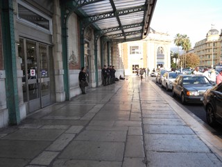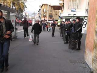 Ci avviamo verso il corteo, relegato, come già era stato annunciato dalla Prefettura di Nizza 2 settimane fa, alla periferia della città. Ci avviamo verso rue de la Republique. Qui i negozi sono chiusi. In fondo a questo lungo corso che affianca la zona dell'Acropolis ed il Palais des Expositions, c'è la manifestazione.