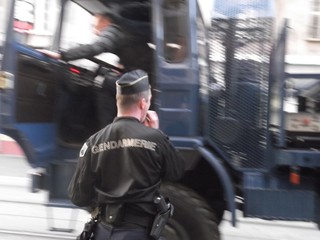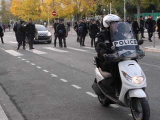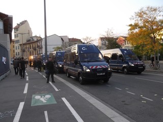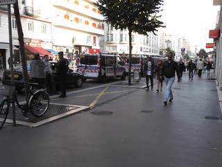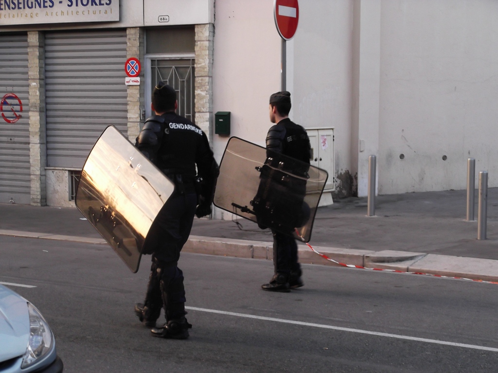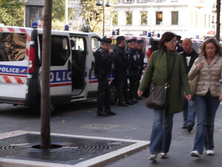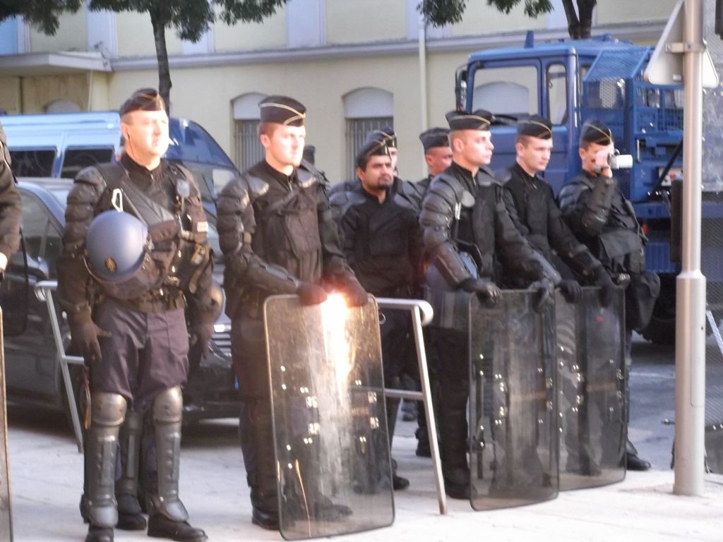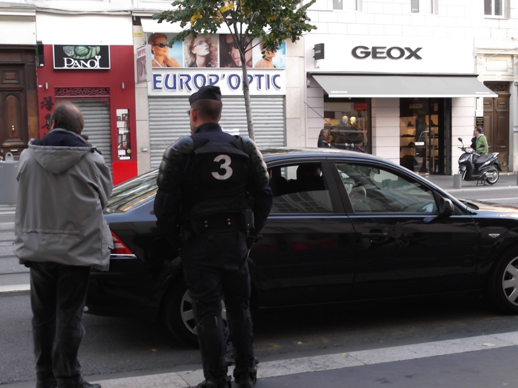 I marciapiedi su entrambi i lati sono costeggiati da camioncini parcheggiati della Police Nationale. A bordo, su ciascun camioncino, contiamo 4 o 5 poliziotti. Ed altri sono fuori. Quasi tutti gli uomini i sembrano equipaggiati con giubbotti antiproiettile e tute rinforzate di ultima generazione.