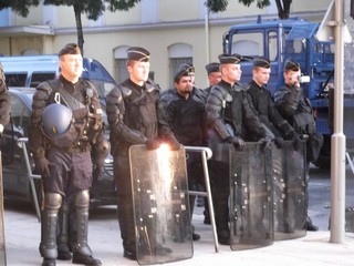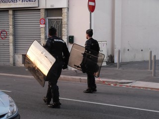 Qui in rue de la Republique è tutto chiuso. Il rumore dell'elicottero è più vicino. Dal fondo iniziamo a percepire dei "disordini" gli slogan dei manifestanti pronunciati al megafono. Prima di affacciarci sul corteo, altri dispiegamenti straordinari della Gendarmerie.