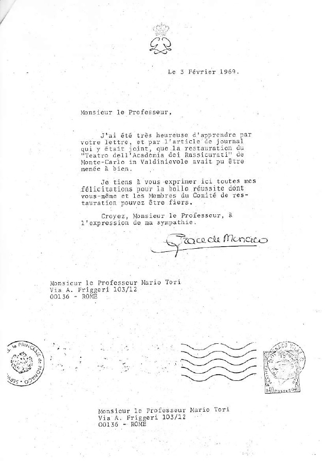 Grace ed il Principe Ranieri andarono a visitare la Montecarlo italiana ed il teatro, anche se non sono rimaste fotografie di quel passaggio. Questa lettera, firmata dalla Principessa Grace, saluta il bel lavoro svolto per il recupero del Teatro.