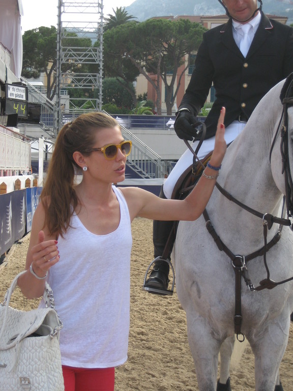 Elegante e raffinata anche quando è casual: eccola Charlotte Casiraghi, in tutta la sua bellezza, al Jumping International Montecarlo e qualche ora prima della Monaco Pro-Am Cup (la competizione per team di due atleti amatore + professionista che debutta alle 21.15 venerdì 29 giugno). Charlotte, disinvolta e sorridente fa naturalmente gli onori di casa sul campo monegasco. Ambasciatrice di bellezza e icona di questo sport. in questo pomeriggio con un tocco decisamente "patriottico": il bianco e rosso sono i colori nazionali del Principato.