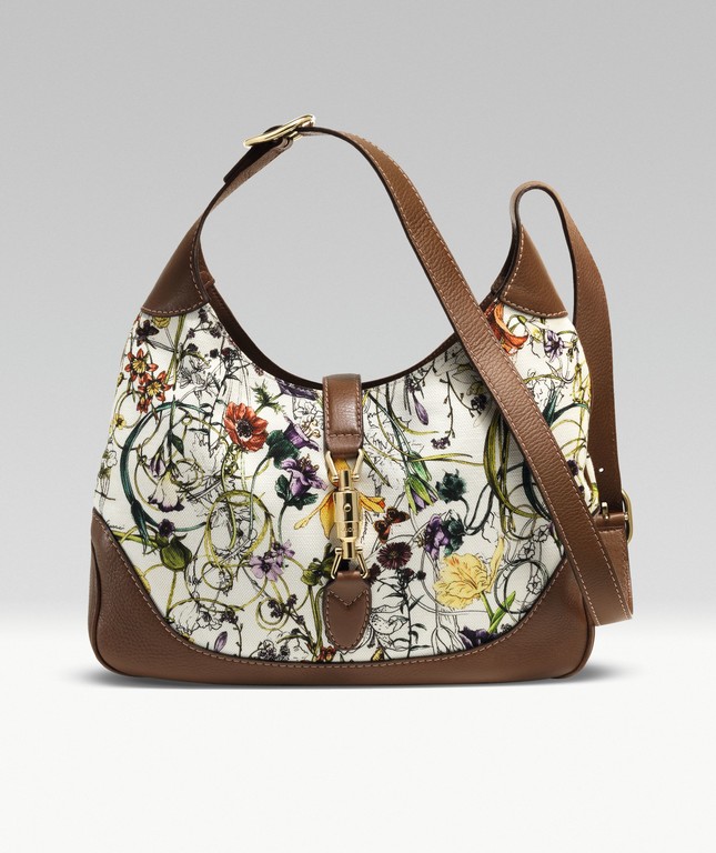 Ed ecco, per la Cruise 2013, la distintiva collezione di borse, caratterizzate dall’iconico motivo Flora, ad impreziosire il guardaroba rilassato della donna Gucci. La stampa è oggi stilizzata, attraverso intricati giochi di grafiche sovrapposte, con tratti bianchi e neri dall’effetto incompiuto per un mood fresco, che evoca il fascino dei fiori, di ogni stagione. Flora sboccia sul canvas naturale sulle New Jackie e la New Bamboo, insieme alla Boston bag e alla tote con manico superiore – tutte con profili di pelle a contrasto.