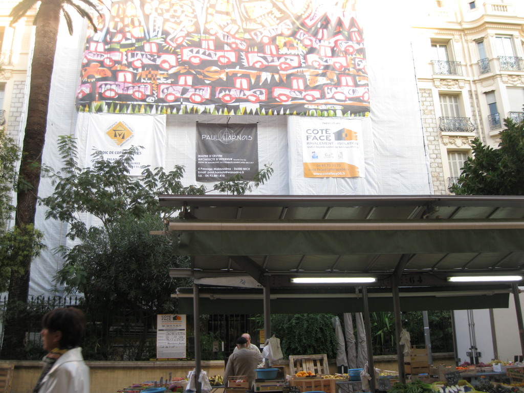 Lungo Rue Clément-Roassal si svolge durante la settimana (con eccezione del lunedì) parte del grande mercato alimentare di Liberation: un’occasione in più per andare ad ammirare la grande riproduzione che copre parzialmente un palazzo costruito nel 1910 per opera dell’architetto nizzardo Charles Bellon, uno dei maggiori costruttori della Belle Époque.