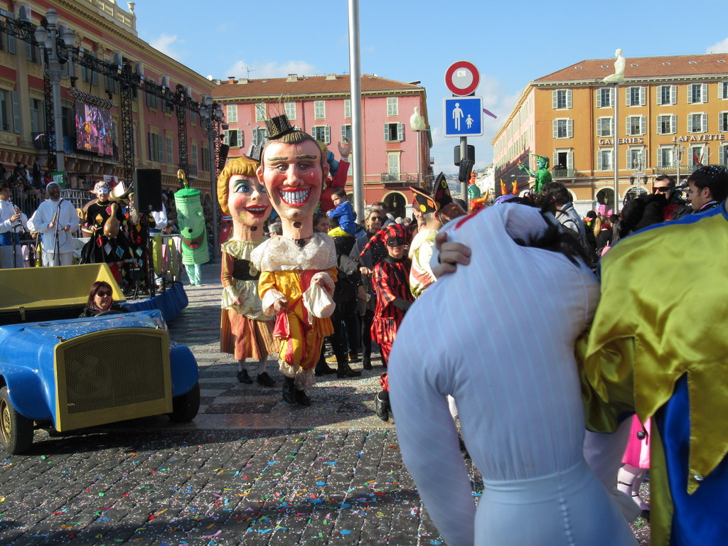 Carnevale a Nizza di domenica pomeriggio, senza le luci dei carri e senza proiettori colorati, senza i led e senza le dissolvenze, ma con il sole che rischiara.
