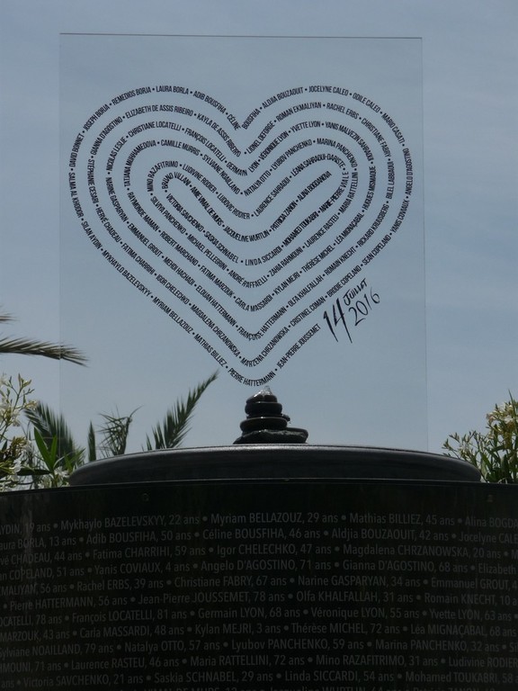 In attesa che, sempre lungo la Promenade, venga inaugurato il memoriale definitivo, in una data successiva a quella del prossimo 14 luglio, è ora Villa Massena ad accogliere il memoriale che, non senza emozione, ricorda quanti hanno perso la vita in una sera di festa, elencandone i nomi in un grande cuore. Di notte è illuminato e reca la scritta “En memoire de nos Anges”.