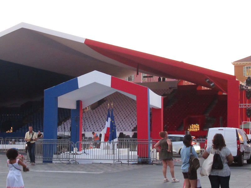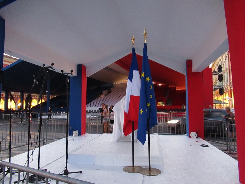 Place Massena è il centro attorno al quale ruotano tutte le cerimonie. Il grande palco, la “casetta” con i colori della bandiera nazionale all’interno della quale parleranno il Presidente della Repubblica Emmanuel Macron, il Sindaco di Nizza Christian Estrosi e Paoline Murris, presidente dell’Associazione Promenade des Anges.