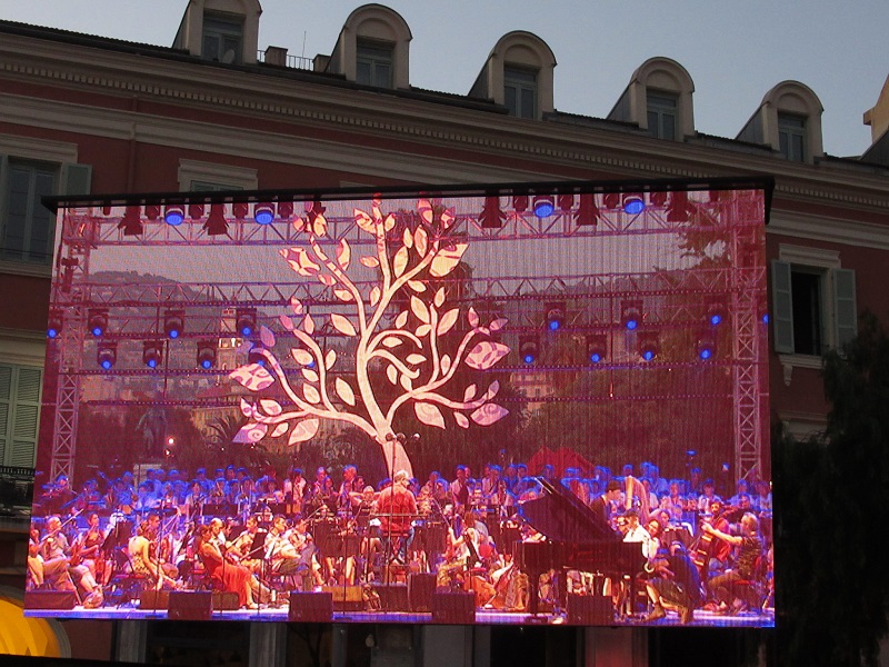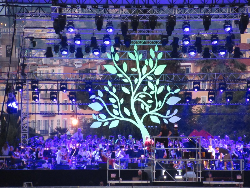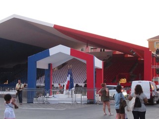 Il grande palco, all’interno della Promenade du Paillon nel quale “provano” i coristi, la filarmonica e il cantante Calogero.