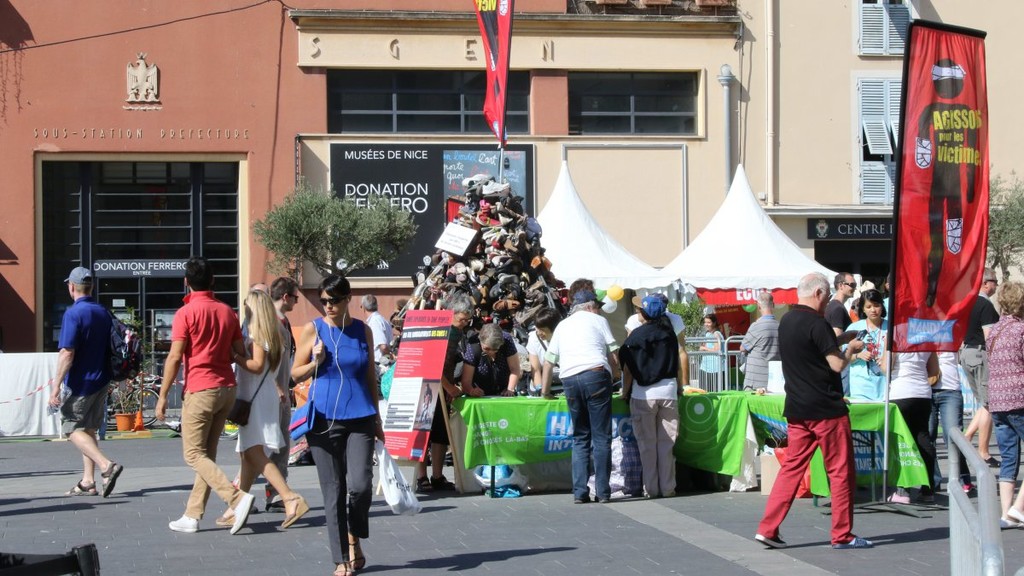 Per riuscire nell’impresa invita la popolazione a portare vecchie scarpe in Place Massena dove verrà realizzato un villaggio con lo scopo di sensibilizzare sui danni che bombe e mine creano alle persone, anche a quelle che non partecipano direttamente a guerre o battaglie.