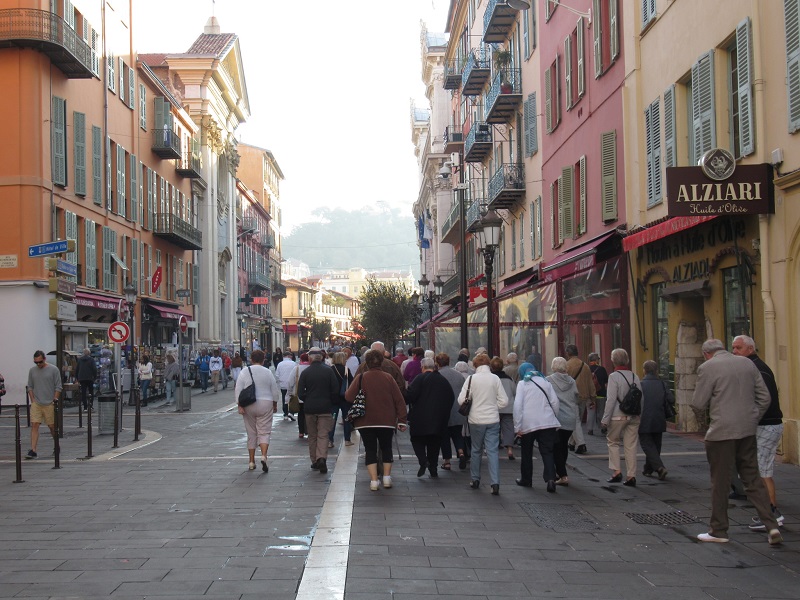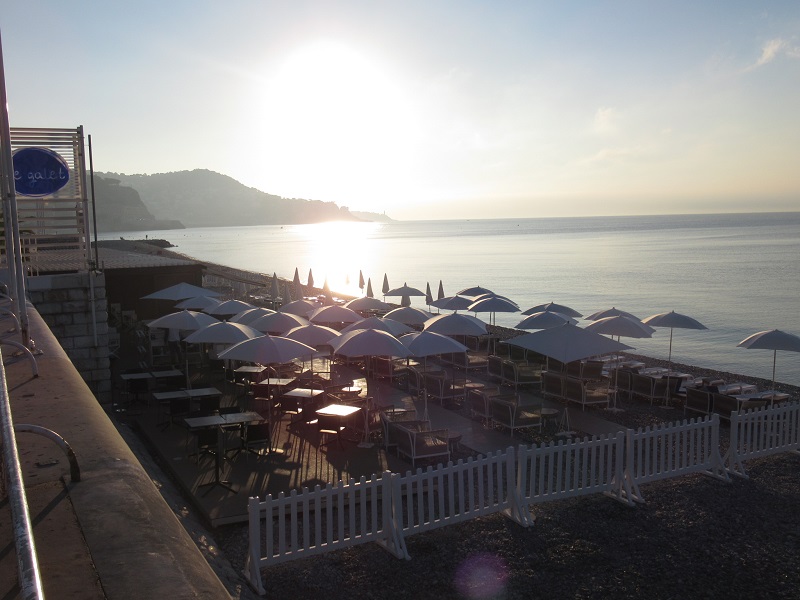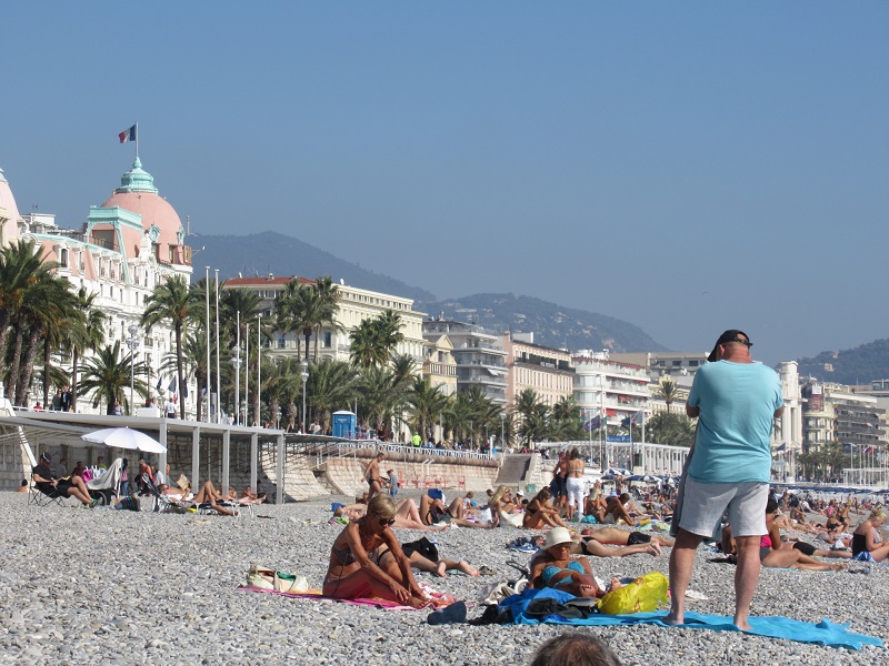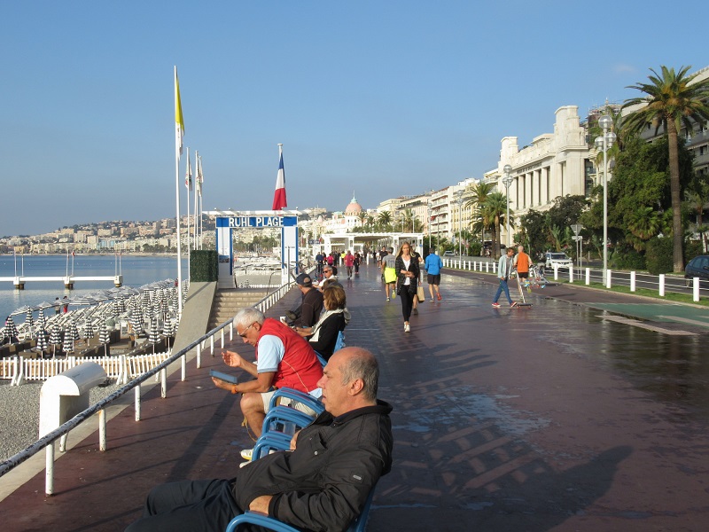 Una tranquilla domenica d’autunno, con l’acqua del mare sopra i 20 gradi, il sole che picchia forte, le spiagge e sufficientemente affollate e la Promenade des Anglais come a inizio estate.
