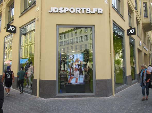 Propone prodotti di molte marche tra le quali Nike, Adidas, Lacoste, Fila, Converse, Puma, Ellesse, Reebok, Asics, New Era. JD Sports, con uno spazio vendita di 1.500 metri quadrati, su più piani, ha preso il posto dei magazzini H&M che hanno chiuso alla fine del 2017 e si trova nella zona “alta” di Avenue Jean-Médecin, quasi di fronte alla basilica di Notre Dame.