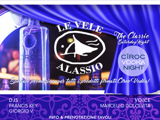 Le Vele Alassio - The Classic Saturday Night, ed il titolo dice tutto: il leggendario sabato notte della Riviera ligure di Ponente firmato Le Vele Alassio! Questo sabato Le Vele Alassio presenta Cîroc Vodka Night: la vodka francese a base di uve Mauzac Blanc. Speciale promozione per tutti i prodotti firmati Cîroc Vodka! L'ingresso è in riduzione per le donne entro le ore 00:00 e ridotto tutta la notte per i possessori della Resident Card. Arrivate presto, fate festa insieme a noi e aspettiamo l'alba insieme!