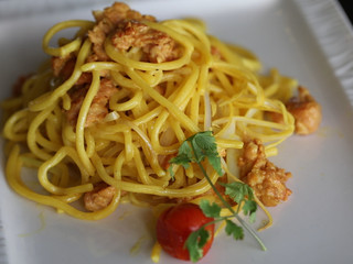 Spaghettoni con porri e salsiccia italiana, salsa allo zafferano 14 €