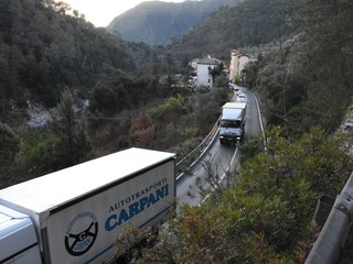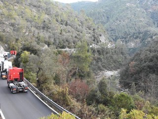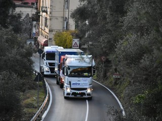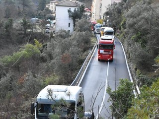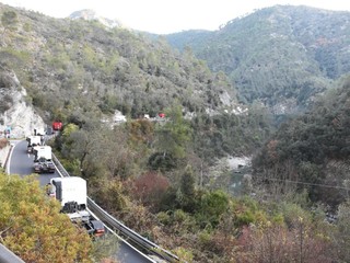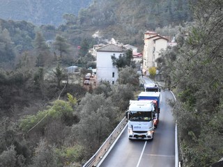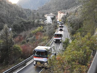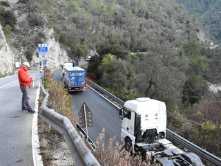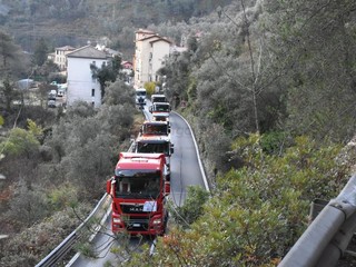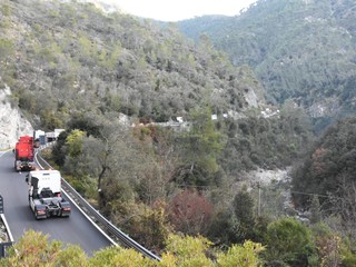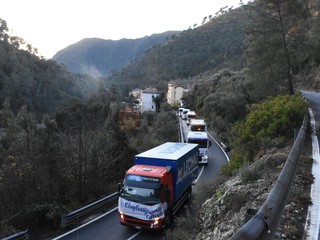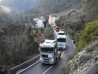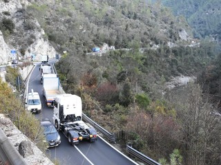 Traffico paralizzato in Val Roya per la protesta in atto che vede i tir procedere a passo di lumaca alla volta del confine di Fanghetto. I mezzi sono partiti questa mattina intorno alle 6.30 da Trucco per protestare contro quello che gli autotrasportatori italiani definiscono il ‘divieto della vergogna’.