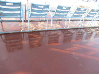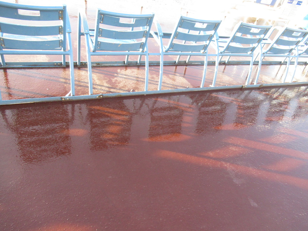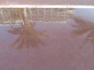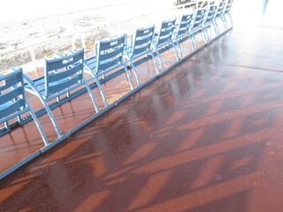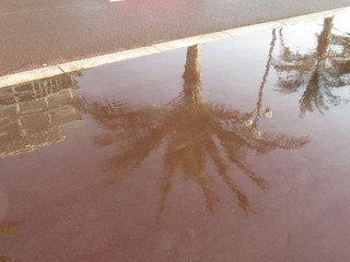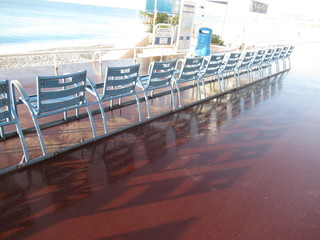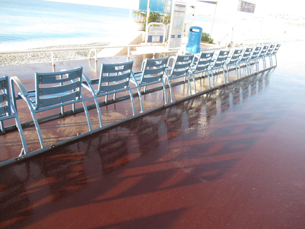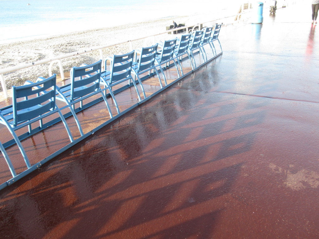 La Promenade des Anglais, allora, cambia colore e sul largo marciapiede, ancora bagnato dall’acqua utilizzare per pulire, si specchiano le palme e le sedie blu.