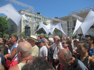 Quando sale sul palco, posto in Boulevard Victor Hugo, il sole è a picco e la canicola colpisce duramente, ma il piazzale è colmo a dismisura.