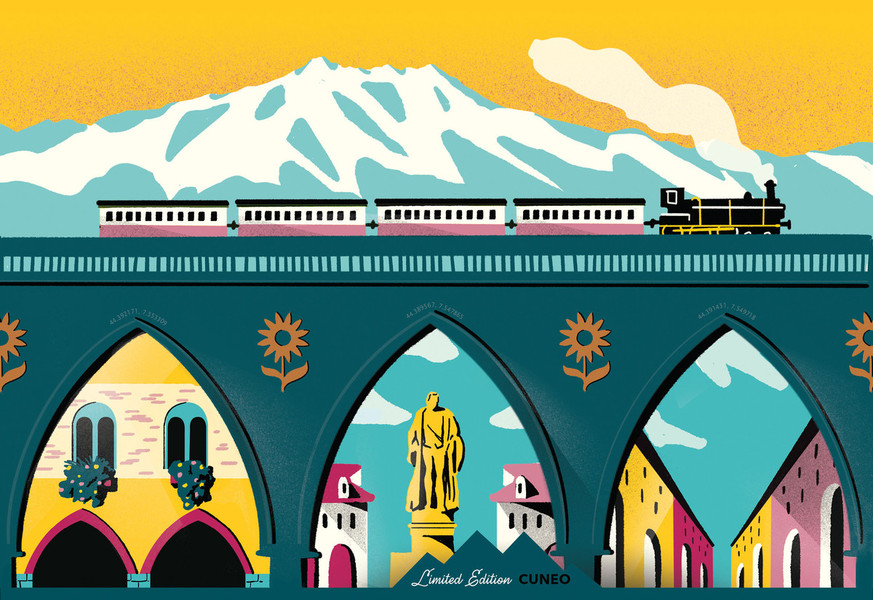 Gastaldi, nella sua tavola, che avvolge la serie di “Gocce” Pet Premium Limited Edition Cuneo, racconta Cuneo attraverso colorati scorci della città e bellezze naturali, la statua di Giuseppe Barbaroux, conte e avvocato giureconsulto, che campeggia in piazza Galimberti, il treno storico a vapore che collega Cuneo alla Francia e alla Liguria e, sullo sfondo, i fiori e le alte montagne della Provincia Granda, note in tutto il mondo.