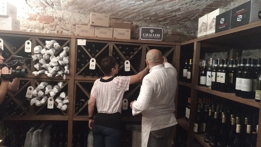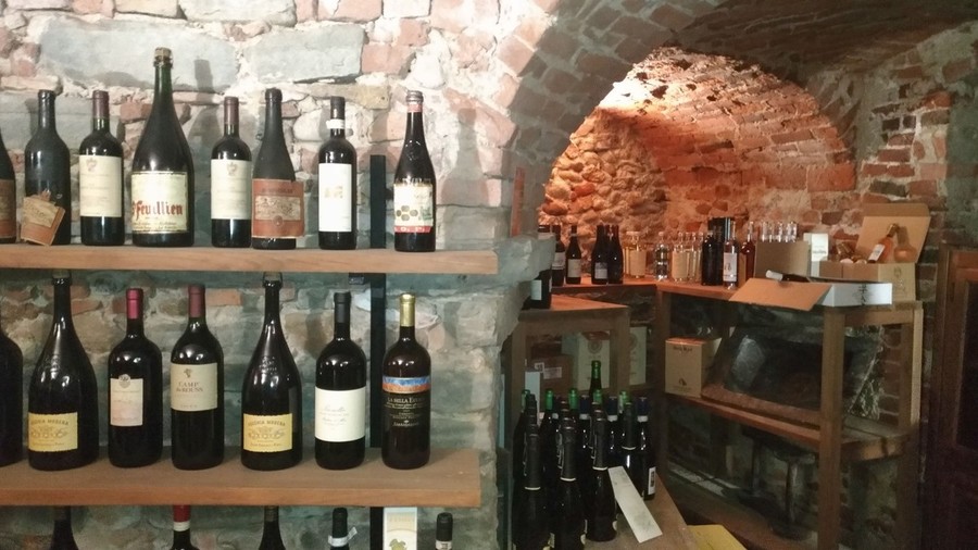 Fornitissima la cantina che si trova proprio sotto la chiesa dei Battuti Neri. C'è una vasta gamma di vini, dalle bottiglie di dolcetto, barbera, barolo, nebbiolo e barbaresco. “Il vino scorre nelle nostre vene, abbiamo passione per la carne e per il buon vino”, commenta Chiara Gallesio.