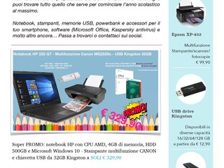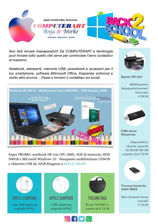 Mancano pochi giorni alla riapertura delle scuole, non fatevi trovare impreparati. Non aspettate l'ultimo giorno per andare alla ricerca di ciò che vi serve per iniziare l'anno scolastico. Il consiglio è quello di preparare con anticipo il materiale scolastico, che servirà durante l’anno. Questa cosa vi può aiutare a placare in parte l'ansia da primo giorno. I ragazzi di oggi vivono nell’epoca dei social network, in quella che può essere definita smart society, e anche la scuola sta diventando più smart e tecnologica. Sempre più scuole stanno aprendo le porte alle nuove tecnologie, pertanto non fatevi trovare impreparati. Da Computerart a Ventimiglia in via Cavour, 1 potrete trovare notebook, stampanti, memorie USB, powerbank e accessori per il vostro smartphone, software (Microsoft Office, Kaspersky antivirus) e molto altro ancora...