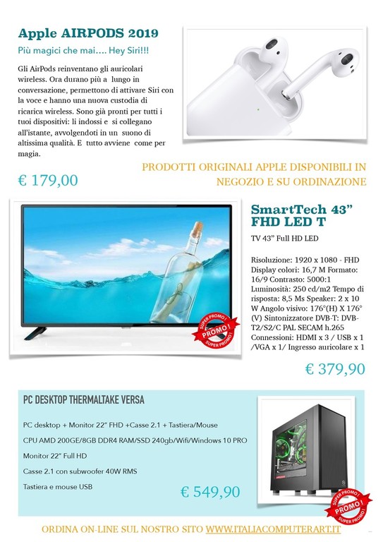 Andate a scoprire le Super Promo realizzate ad hoc per un inizio di scuola davvero tecnologico. Approfittate della promozione speciale sui fantastici Apple AIRPODS 2019, disponibili a soli 179 euro. Lo staff di Computerart si occupa anche della sicurezza digitale e online, per far navigare i vostri figli in assoluta sicurezza, proteggendoli dalle insidie del Web. Sono disponibili anche finanziamenti su misura.