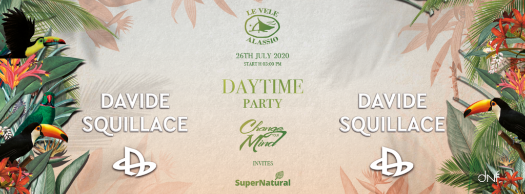 LE VELE ALASSIO presents DAYTIME PARTY CHANGE YOUR MIND invites SUPERNATURAL w/ DAVIDE SQUILLACE TIME TABLE 15:00 > 18:00 - Francis Key 18:00 > 20:00 - YoUniverse 20:00 > ??? - Guest: Davide Squillace ??? > END - 100% Change Your Mind Soundsystem