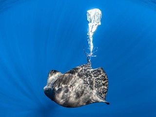 La plastica rappresenta il 95% dei rifiuti sulle spiagge e nel Mar Mediterraneo. È un pericolo per la biodiversità marina: è la causa della significativa mortalità della fauna selvatica a causa di casi di intrappolamento di plastica, come mostrano queste istantanee di una razza (conosciuta anche con nome di pastinaca) con la coda bloccata nella spazzatura o ingerita.