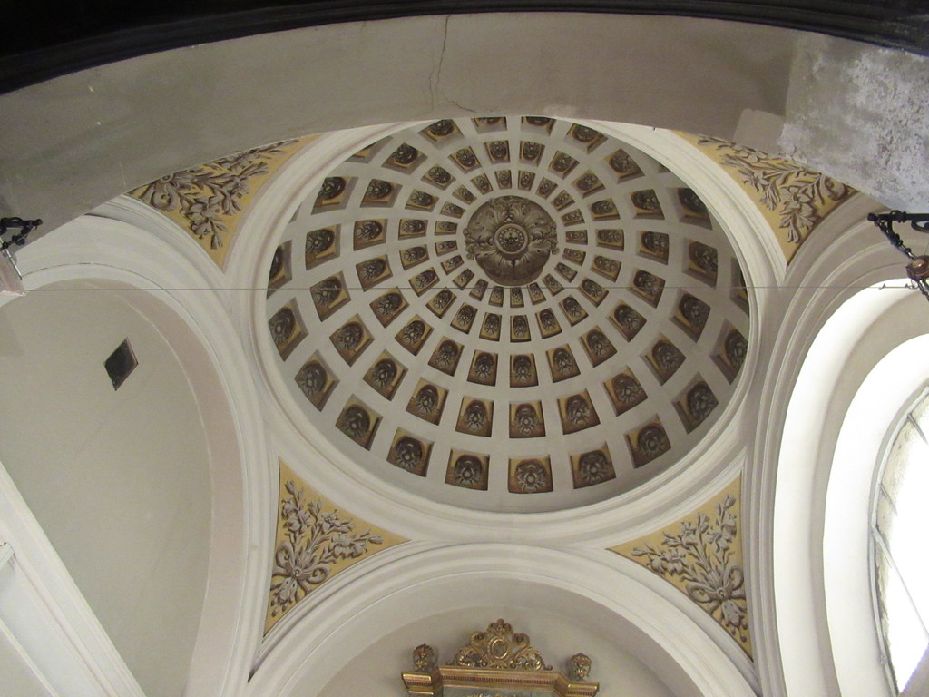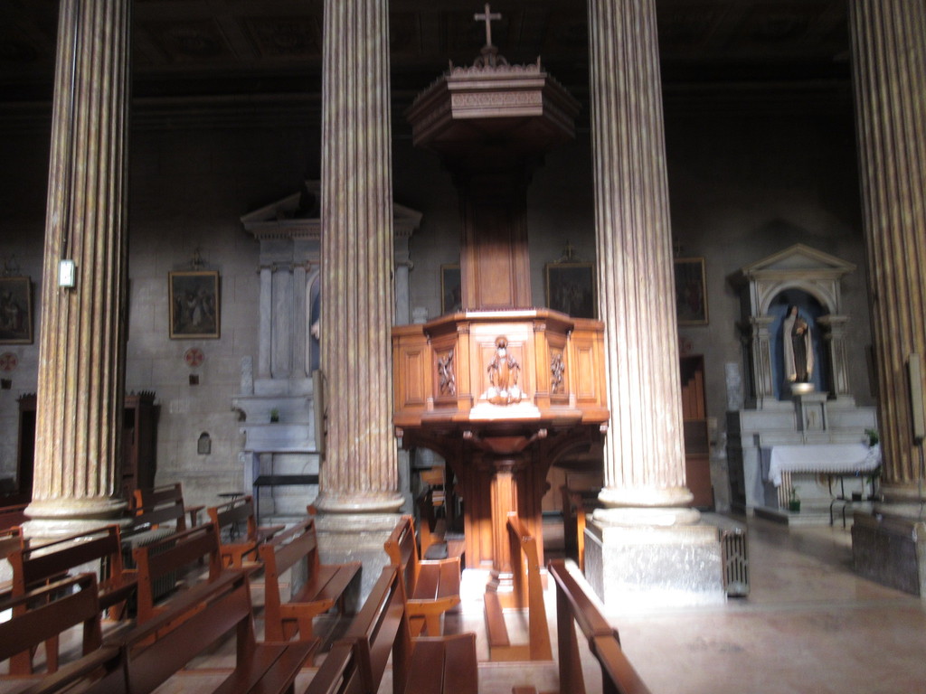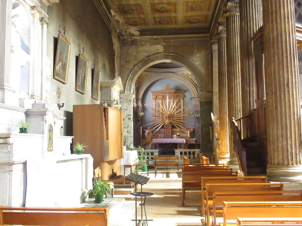 L’interno è ampio: la navata centrale misura trenta metri di lunghezza e quattordici ed è contornata da 24 colonne in stile jonico che delimitano le due navate laterali.