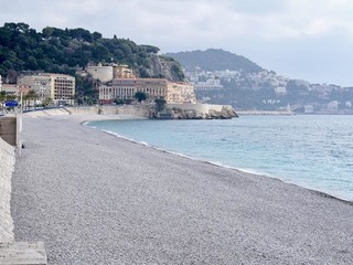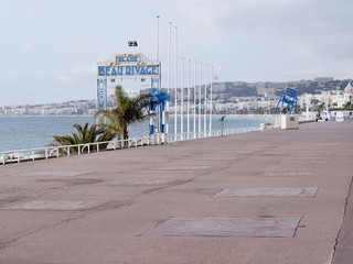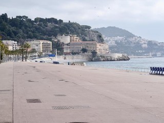 Foto di una Nizza deserta, foto della Promenade e della spiaggia senza persone.