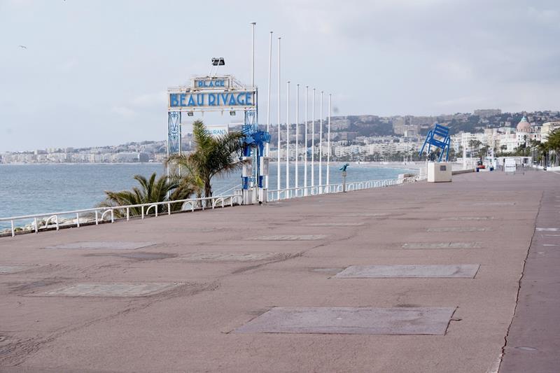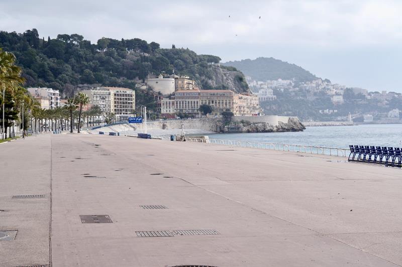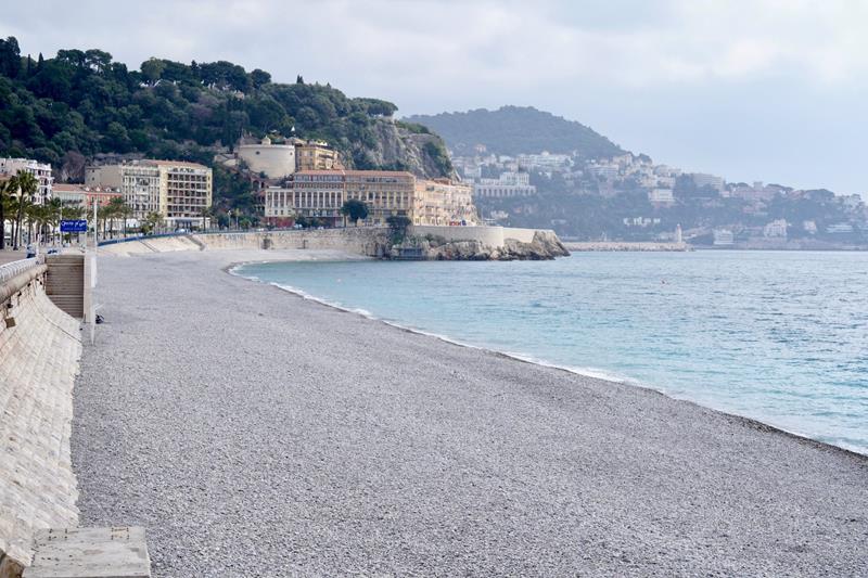 Foto di una Nizza deserta, foto della Promenade e della spiaggia senza persone.