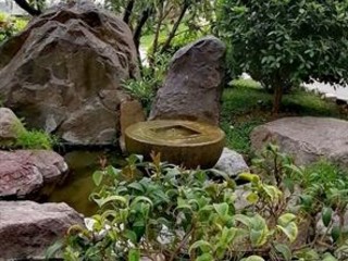 Un laghetto situato ai piedi del padiglione consente di ammirare una collezione di carpe Koï, che nuotano tranquillamente tra ninfee e fiori di loto.