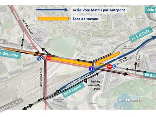 - Route de Grenoble, il traffico sarà chiuso in direzione ovest-est tra Boulevard Paul Montel e il ponte SNCF. L'asse Nord-Sud sarà aperto per raggiungere Boulevard René Cassin.