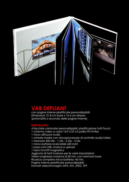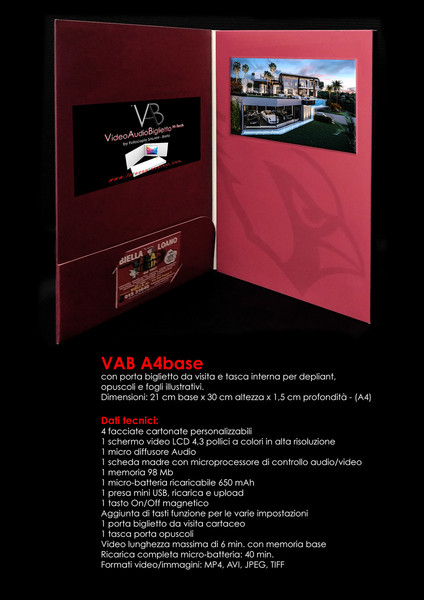 VAB è adatto per le presentazioni, le mostre, la realizzazione di cataloghi e manuali, per il lancio di nuovi prodotti e nuove campagne pubblicitarie, o ancora per realizzare biglietti di auguri personalizzati, per le conferenze e i meeting, in particolar modo per le professioni di nuova generazione e tutti gli eventi, le cerimonie, gli show commerciali che vengono organizzati sempre più frequentemente.