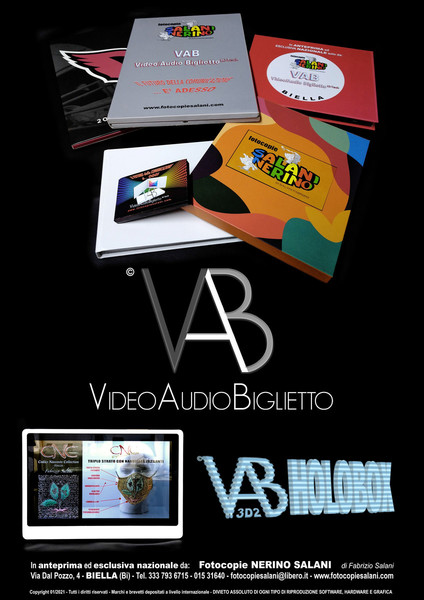 Il progetto VAB nasce dalla mente creativa del biellese Fabrizio Salani che, da sempre, pensa e vive la pubblicità in modo fuori dal comune. Fu uno dei primi creatori delle mascherine personalizzate nel periodo del lockdown di marzo dello scorso anno; oggi, in esclusiva, presenta una gamma di prodotti hi-tech dedicati al mercato della comunicazione pubblicitaria del lusso e dell'unicità, per stupire, attrarre e affascinare la clientela più esigente.