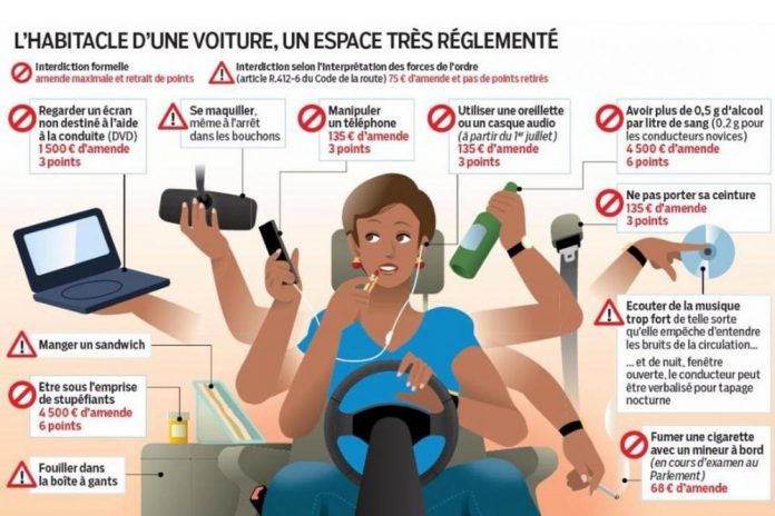 Vietato mangiare durante la guida, anche un panino, torta, frutta o di frugare nel vano portaoggetti, resta a discrezione della polizia o della gendarmeria una multa di 75 euro.