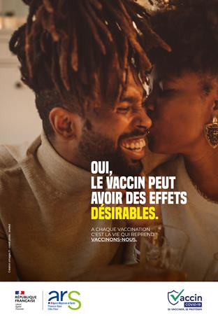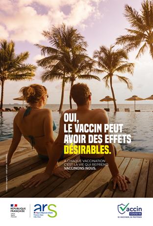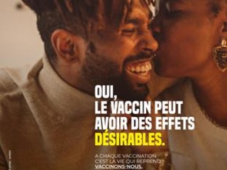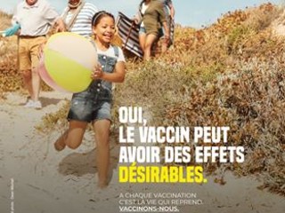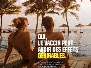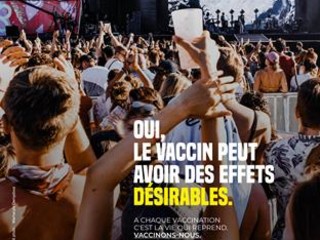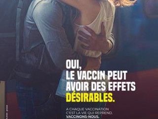 Lo slogan , in francese, suona così: “Oui, le vaccin peut avoir des effets désirables” ( Sì, il vaccino può avere effetti desiderabili) e le immagini a corredo della campana stampa vanno da un bacio appassionato alla partecipazione gioiosa ad un concerto all’aperto, da un abbraccio alla stazione alla serenità ai bordi di una piscina fino a quella di una famiglia che si reca in spiaggia.