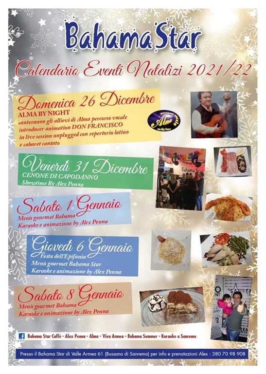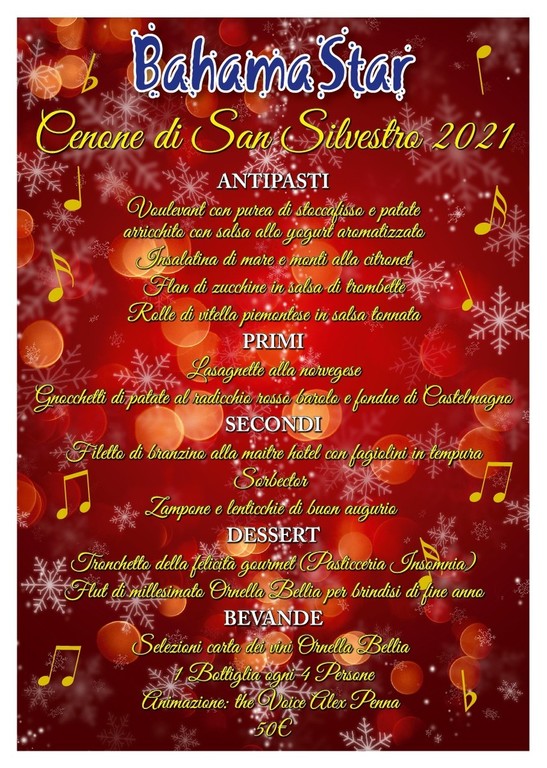 Sabato 1 gennaio Menù gourmet del Bahama Star, Karaoke e animazione by Alex Penna.