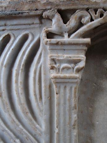 Détail de la stèle funéraire d’Epicadus Velox, Ier siècle, nécropole de la Voie romaine. Le fronton est décoré de deux capricornes affrontés autour d'un cercle.