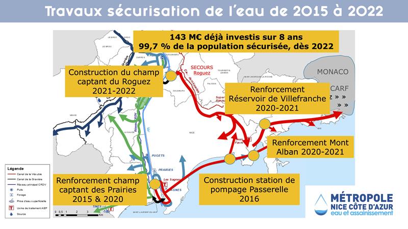 Al momento attuale il Dipartimento delle Alpi Marittime registra un deficit del 20% di acqua, fatto che non accadeva dal 1959 e, sul territorio della Métropole, entro il 2070, Météo France prevede un aumento del 30-50% degli episodi di siccità: “La situazione è grave, ma a Nizza è stata anticipata dagli investimenti che abbiamo fatto negli ultimi dieci anni. Questi pesanti investimenti hanno permesso di assicurare, ad oggi, l'approvvigionamento di acqua potabile, al 99,7% della popolazione metropolitana”.