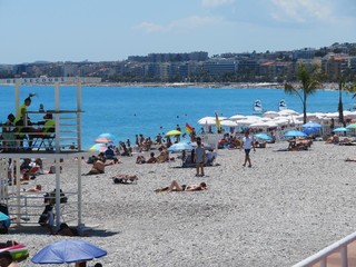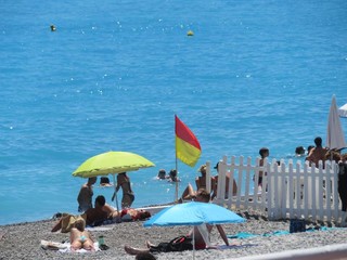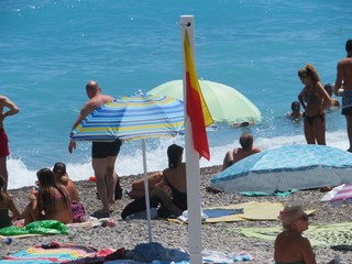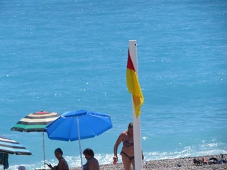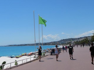 La Promenade des Anglais è più imbandierata che mai: non solo con i “drapeaux” della città e di varie nazioni, oltre che dell’Europa, ma anche con quelli che indicano lo stato delle spiagge e dell’acqua.