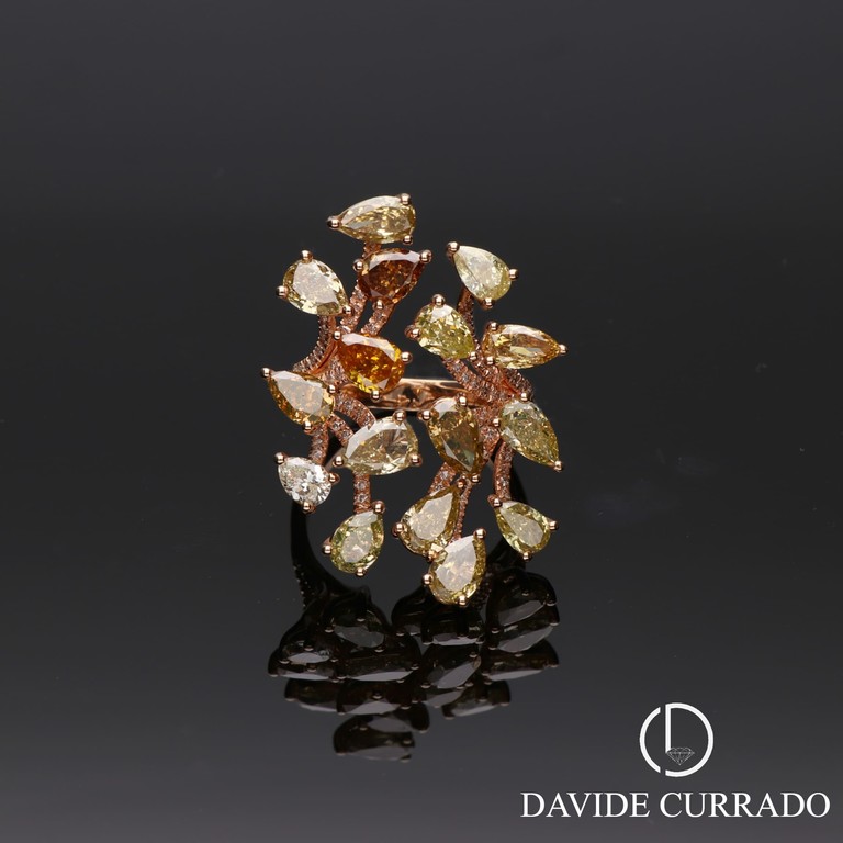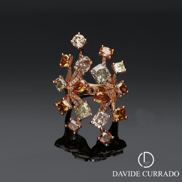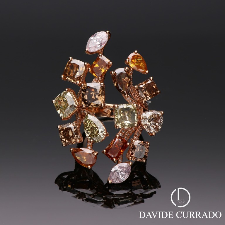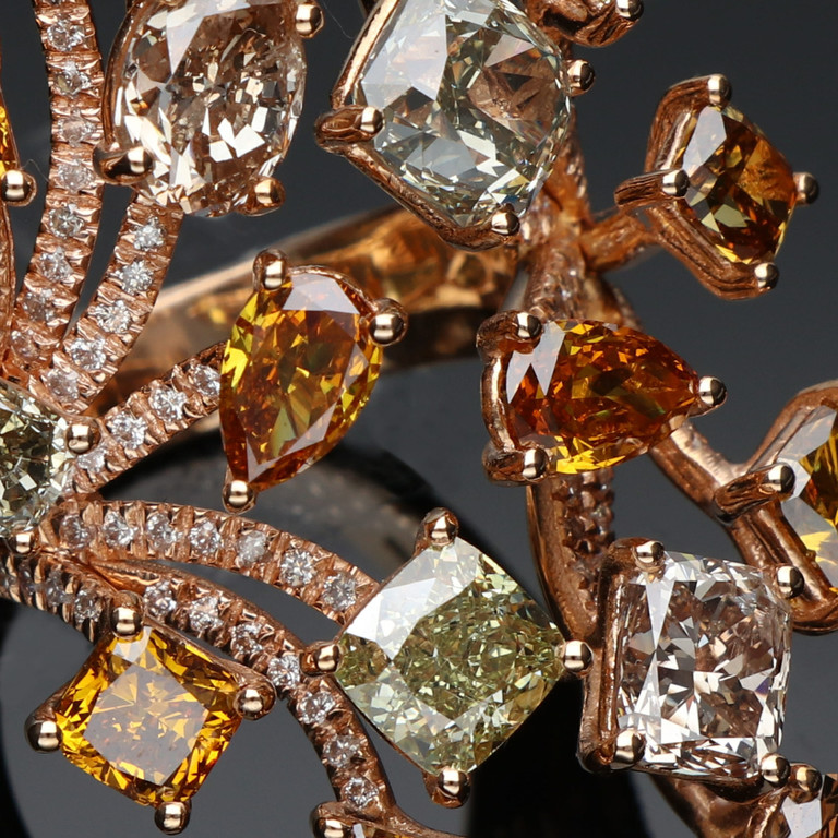 Le policromatiche colorazioni dei diamanti passano dal giallo, al verde, al cognac ma si presentano anche in tonalità molto più rare come l’arancione e il rosa. Variegate risultano essere anche le tipologie di taglio utilizzate per le creazioni.