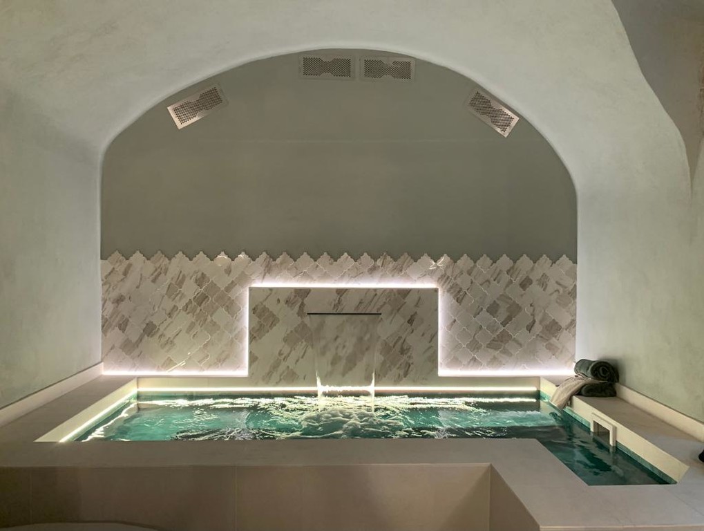 In effetti raggiungere la struttura passeggiando tra i vicoli del borgo medievale ha un che di fiabesco e fa venir voglia di spegnere il cellulare e lasciarsi andare ai piaceri della vita. Un’oasi di benessere dove l’acqua non poteva assolutamente mancare!