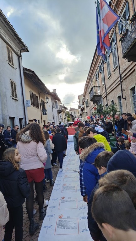 Babbo Natale e la sua slitta hanno impiegato oltre un’ora e mezza per srotolare lungo le vie di Marene, le migliaia di letterine arrivate da tutta Italia per confezionare la lettera natalizia più lunga del Mondo. Si, ben 3.841 metri di stupende frasi scritte da bambini di tutte le età e province d’Italia. Una lettera che con la sua importante lunghezza ha voluto rendere omaggio al Monviso, il Re di Pietra.